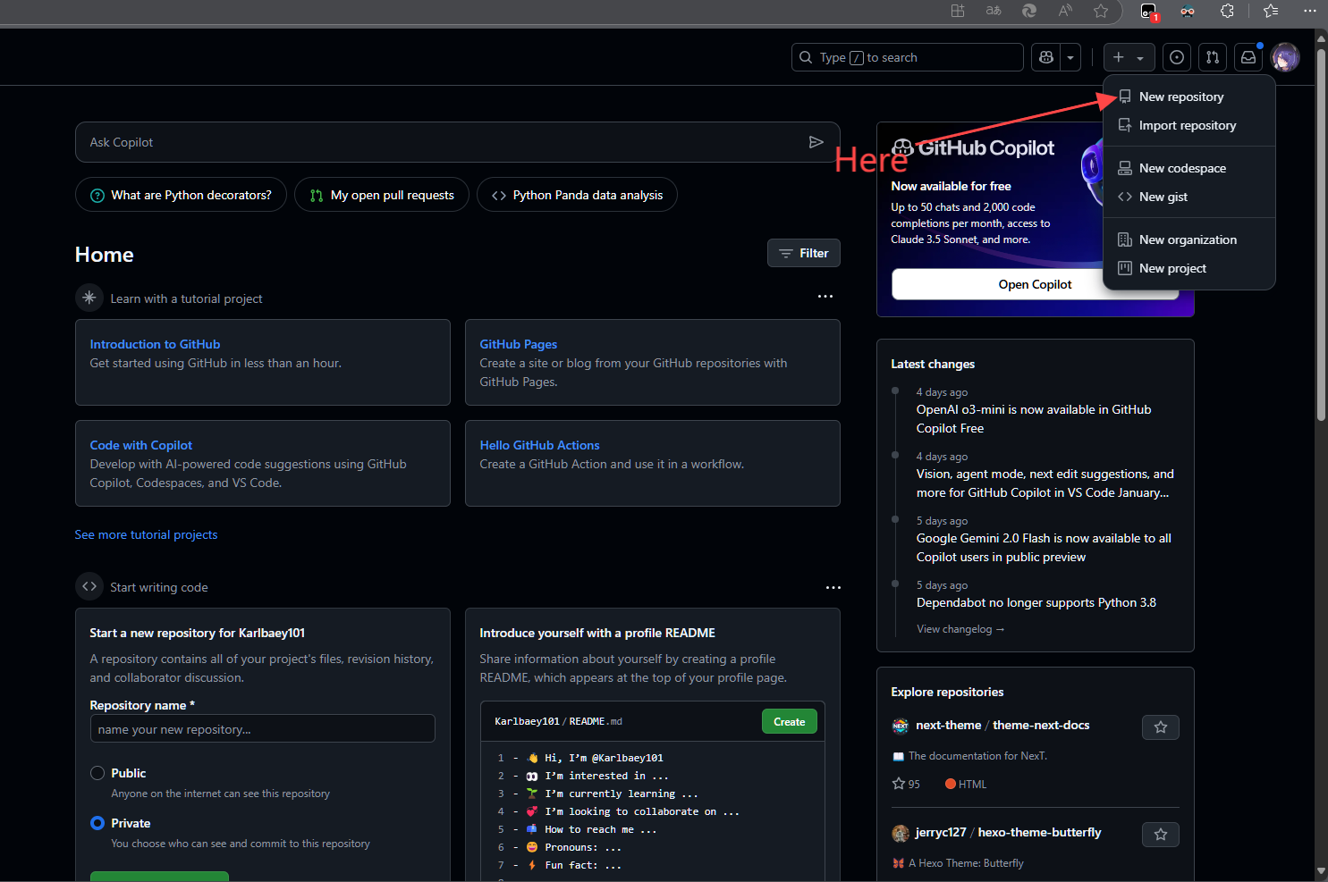 注意: 此处需要一个新仓库(Repository),仓库名称格式:用户名.github.io。比如卡尔白的就是:karlbaey101.github.io。
